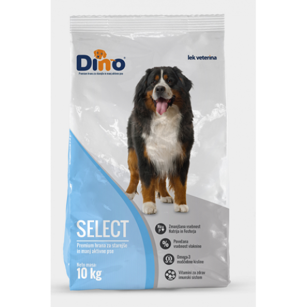 Dino Select Premiumje hranaza starejše in manj aktivne pse. Odlikuje jo znižana vsebnost beljakovin in energije, obogatena pa je s selenom in vitaminom E ter drugimi antioksidanti, ki klinično dokazano upočasnjujejo procesa staranja telesnih celic. Tako omogočajo izboljšano funkcijo vseh pasjih organov. Povečana vsebnost vlaknine zmanjšuje možnost pojava prekomerne telesne mase psa, zmanjšana vsebnost natrija in fosforja pa manj obremenjuje ledvice.